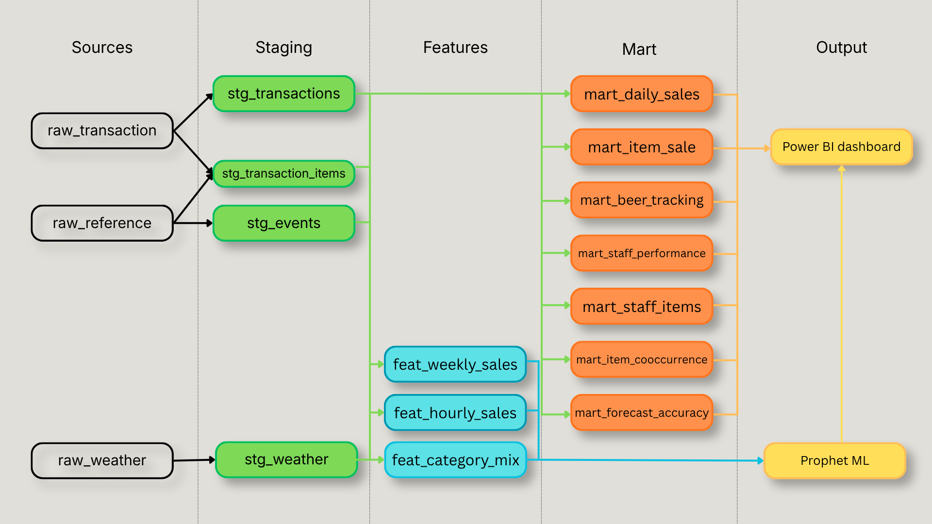 The outputs are Prophet and Power BI. Prophet reads exclusively from the feature layer. Power BI reads exclusively from the mart layer and from Prophet's forecast tables.
