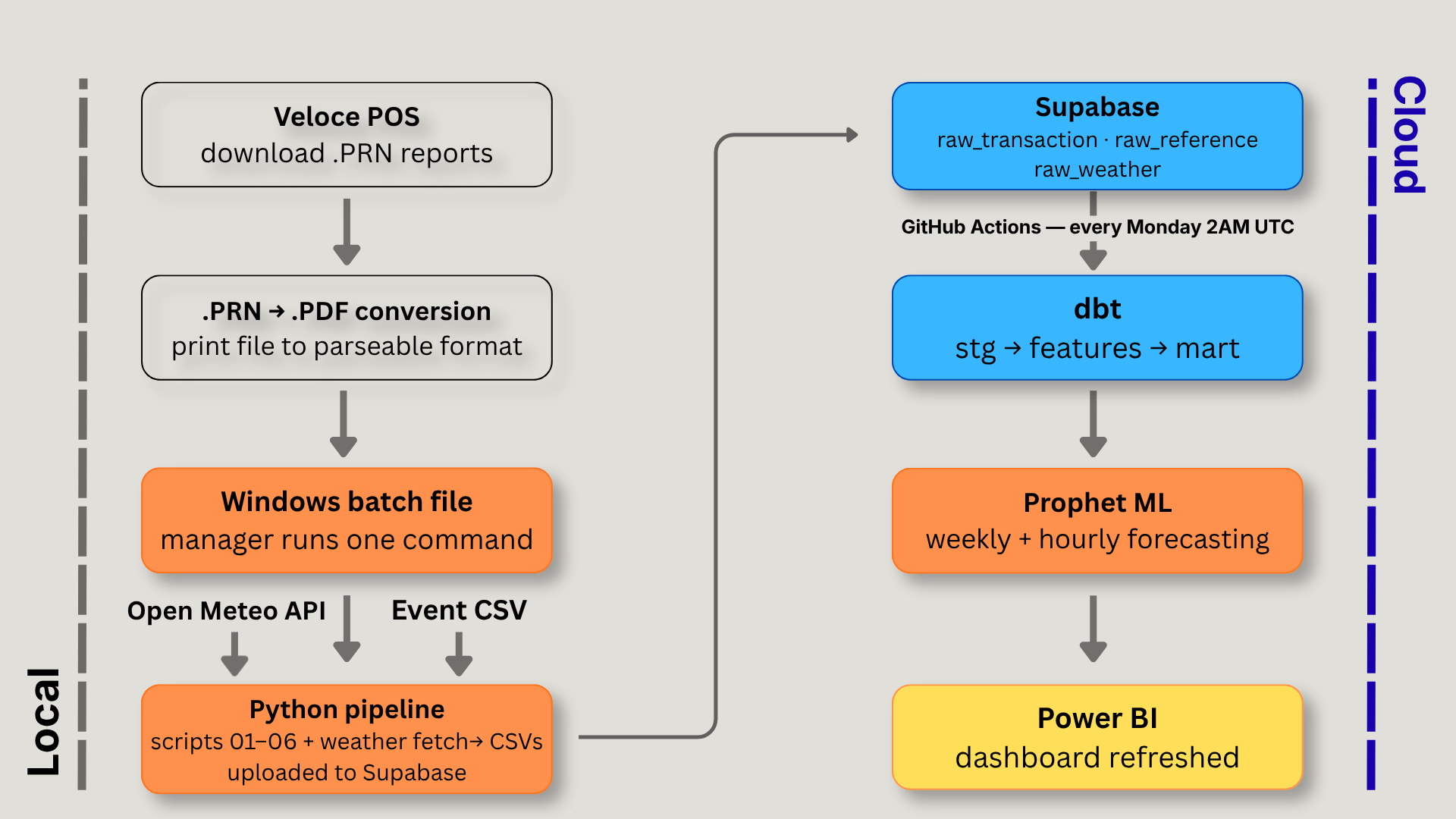 The pipeline is designed around a non-technical user. The restaurant manager downloads the weekly reports from Veloce, places them in a designated folder, and runs a single Windows batch file. That triggers the master runner — six extraction scripts in sequence, weather fetch, and upload to Supabase. A GitHub Actions workflow picks up from there, running dbt transformations and the Prophet forecasting models every Monday at 2AM UTC.