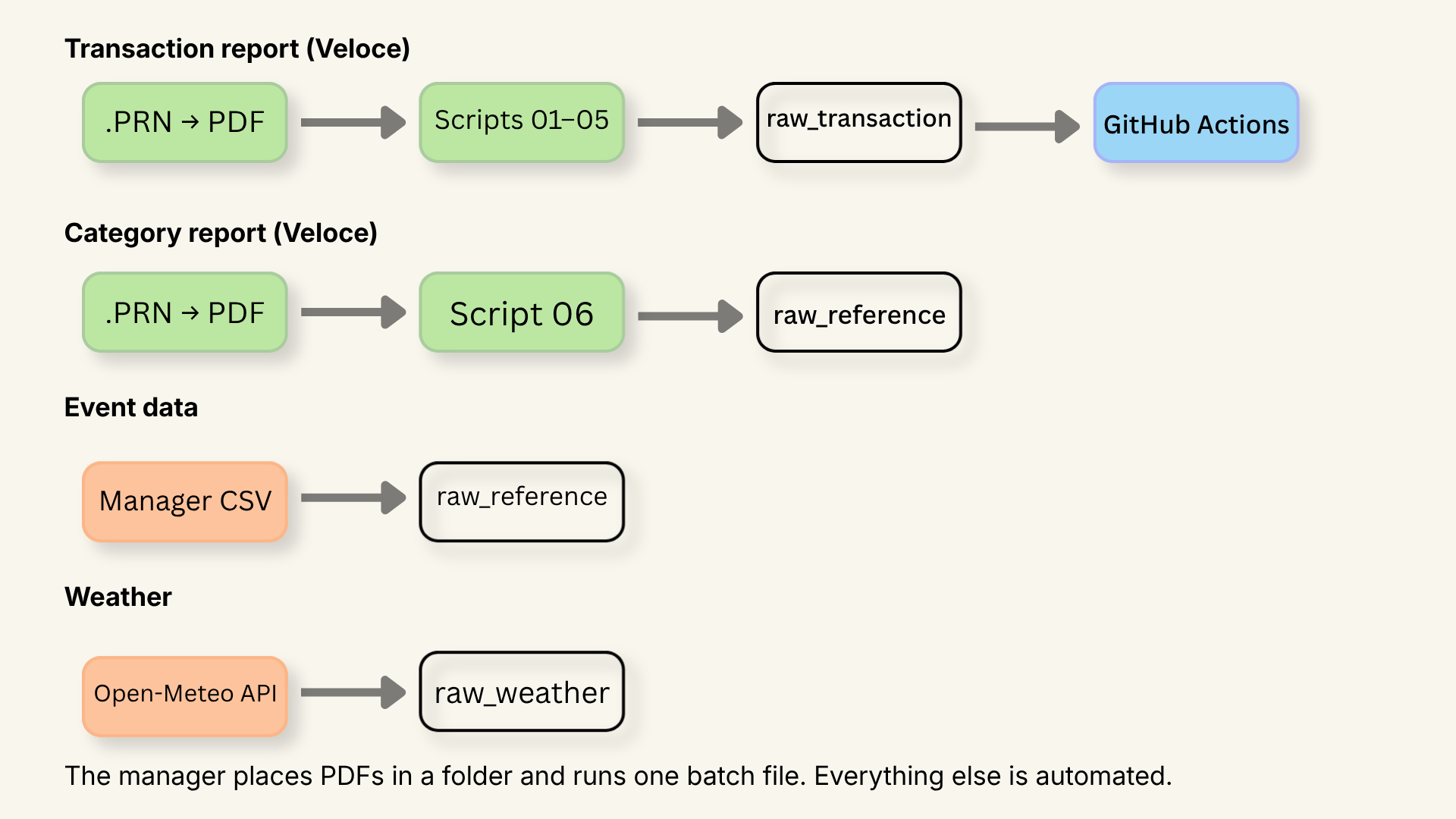 Starting from scratch turned out to be an opportunity: with no existing architecture to work around, I could build a clean ELT pipeline from the ground up rather than inheriting someone else's ETL mess. The logic is simple — export the print files as .PRN, convert them to PDF, and parse them with a suite of custom Python scripts. To keep the full process accessible for my stakeholder (the restaurant manager), everything runs through a single batch file.